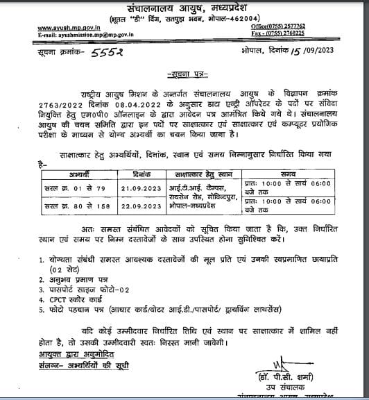 साक्षात्कार के लिये दिनांक, स्थान एवं समय निर्धारित किया गया है। सरल क्रमांक-1 से 79 तक 21 सितम्बर को प्रात: 10 बजे से और सरल क्रमांक-80 से 158 तक 22 सितम्बर को चयन प्रक्रिया होगी। चयन प्रक्रिया आईटीआई कैम्पस रायसेन रोड गोविंदपुरा भोपाल में सम्पन्न होगी। इस संबंध में विस्तृत जानकारी www.ayush.mp.gov.in पर अपलोड की गई है।सबसे अहम बात ये है कि यदि उम्मीदवार निश्चित तारीख और तय समय पर नहीं पहुंचता है तो उसकी उम्मीदवारी निरस्त कर दी जाएगी।