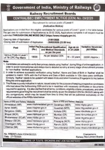 आरआरबी लेवल 1 का शॉर्ट नोटिस 27 दिसंबर 2025 को जारी किया गया था। जिसके मुताबिक कुल 22000 पदों पर भर्ती होने वाली है। असिस्टेंट (ट्रैक मशीन), असिस्टेंट (ब्रिज), ट्रैक मेंटेनर ग्रुप 4, असिस्टेंट (पी-वे), असिस्टेंट (टीआरडी), असिस्टेंट लोको शेड (इलेक्ट्रिकल), असिस्टेंट ऑपरेशंस और पॉइंट्समैन बी समेत अन्य पदों पर नियुक्ति होगी। डिटेल नोटिफिकेशन “CEN 09/2025” जल्द जारी होगा।