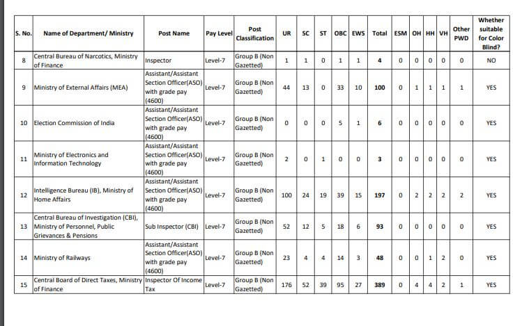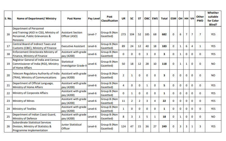 - केंद्र सरकार के विभागों में ग्रुप बी के पदों असिस्टेंट सेक्शन अफसर, इनकम टैक्स इंस्पेक्टर, सेंट्रल एक्साइज इंस्पेक्टर, असिस्टेंट इनफोर्समेंट अफसर, सब इंस्पेक्टर, डाक इंस्पेक्टर, नारकोटिक्स इंस्पेक्टर, एक्जीक्यूटिव असिस्टेंट, रिसर्च असिस्टेंट, डिविजनल एकाउंटेंट, एनआईए सब इंस्पेक्टर, जूनियर स्टैस्टिकल अफसर पर भर्ती होगी।