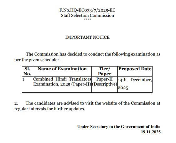 SSC Exam Date 2025: अभ्यर्थियों के लिए महत्वपूर्ण खबर है । कर्मचारी चयन आयोग ने संयुक्त हिंदी अनुवादक (CHT) परीक्षा 2025 की तारीख जारी कर दी है। आयोग द्वारा जारी आधिकारिक नोटिस के अनुसार, पेपर-II परीक्षा (वर्णनात्मक परीक्षा) का आयोजन 14 दिसंबर 2025 को किया जाएगा। सिटी स्लिप एक हफ्ता और एडमिट कार्ड परीक्ष से 3-4 दिन पहले जारी किए जाएंगे। इस परीक्षा के माध्यम से कुल 437 पद भरे जाएंगे।उम्मीदवारों को सलाह दी जाती है कि पेपर-II से संबंधित निर्देश, एडमिट कार्ड, या अन्य किसी भी संशोधन संबंधी सूचना के लिए एसएससी की आधिकारिक वेबसाइट ssc.gov.in पर नजर बनाएं रखें।