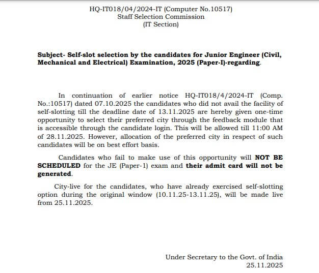 SSC JE Exam City Slip 2025: कर्मचारी चयन आयोग ने जूनियर इंजीनियर भर्ती परीक्षा 2025 के लिए सिटी स्लिप यानी ‘परीक्षा शहर पर्ची’ जारी कर दी है। एसएससी की ओर से जूनियर इंजीनियर के पदों पर भर्ती के लिए सेल्फ स्लॉट बुकिंग की डेट भी एक्सटेंड कर दी गई है। उम्मीदवार 28 नवंबर 2025 तक अपनी सुविधानुसार परीक्षा शहर और परीक्षा तिथि का चयन कर सकते हैं।जिन्होंने सेल्फ स्लॉट बुक कर लिया है वो उम्मीदवार अपने रजिस्ट्रेशन नंबर और पासवर्ड से लॉग इन करके अपने एग्जाम के शहर की डिटेल्स चेक कर सकते है।