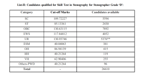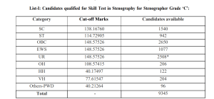 आयोग ने पीडीएफ फॉर्म में रिजल्ट अपलोड किए हैं। इसमें कैंडीडेट्स का रोल नंबर, माता-पिता का नाम और कैटेगरी शामिल है। 35995 उम्मीदवार स्किल टेस्ट के लिए सफल हुए हैं। ग्रेड सी स्किल टेस्ट के लिए 9335 और ग्रेड डी के लिए 26610 उम्मीदवारों का चयन हुआ है।