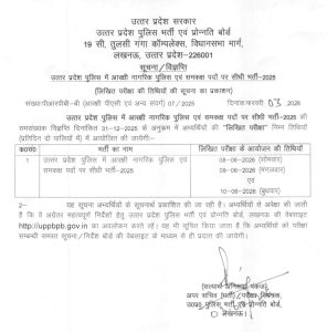 उत्तर प्रदेश के युवाओं के लिए काम की खबर है। उत्तर प्रदेश पुलिस भर्ती एवं प्रोन्नति बोर्ड (UPPBPB) ने आरक्षी नागरिक पुलिस एवं समकक्ष पदों पर सीधी भर्ती-2025 की लिखित परीक्षा की तारीखों का आधिकारिक नोटिस जारी कर दिया है। नोटिस के अनुसार, सिपाही भर्ती की लिखित परीक्षा जून महीने में दो पालियों में आयोजित की जाएगी।