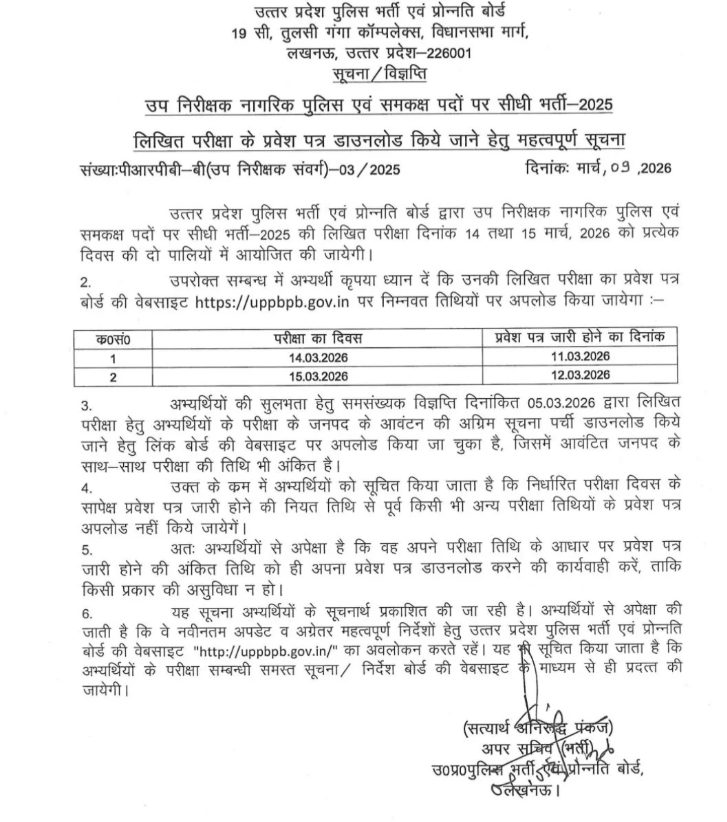 बोर्ड द्वारा जारी आधिकारिक सूचना के अनुसार, यूपी पुलिस एसआई की लिखित परीक्षा मार्च 2026 में दो अलग-अलग तारीखों पर आयोजित की जाएगी। यह परीक्षा 14 मार्च, 2026 और 15 मार्च, 2026 को दो पालियों में संपन्न होगी।