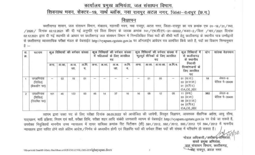 रायपुर, डेस्क रिपोर्ट। Vyapam Recruitment 2022. छत्तीसगढ़ में सरकारी नौकरी पाने का सुनहरा मौका है।जल संसाधन विभाग ने छत्तीसगढ़ व्यावसायिक परीक्षा मंडल, रायपुर (Chhattisgarh Professional Examination Board) के माध्यम से सिविल इंजीनियर 400 पदों पर भर्ती निकाली है।इसकी परीक्षा 8 मई 2022 में आयोजित की जाएगी।उम्मीदवार व्यापम की बेवसाइट vyapam.cgstate.gov.in पर जाकर अधिक जानकारी ले सकते है।इन पदों पर सीधी भर्ती होगी।