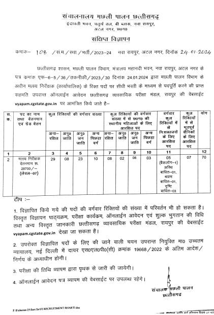 CG Vyapam Recruitment 2024 : छत्तीसगढ़ में सरकारी नौकरी पाने का सुनहरा मौका है। छत्तीसगढ़ व्यावसायिक परीक्षा मंडल ने छत्तीसगढ़ मछली पालन विभाग में मत्स्य निरीक्षक के 70 पदों पर भर्ती निकाली है, जिसकी आवेदन की प्रक्रिया जारी है और लास्ट डेट 22 फरवरी है। इच्छुक और योग्य अभ्यर्थी छत्तीसगढ़ व्यावसायिक परीक्षा मंडल की ऑफिशियल वेबसाइट vyapam.cgstate.gov.in पर जाकर अप्लाई कर सकते हैं।
