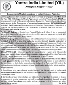 यंत्र इंडिया लिमिटेड (YIL) ने ट्रेड अप्रेंटिस के कुल 3,979 पदों पर भर्ती का ऑफिशियल नोटिफिकेशन जारी किया है। ऑनलाइन आवेदन की प्रक्रिया 1 फरवरी 2026 से शुरू होगी। आवेदन की अंतिम तिथि 3 मार्च 2026 निर्धारित की गई है। योग्य और इच्छुक उम्मीदवार आधिकारिक वेबसाइट recruit-gov.com पर जाकर तय तारीख तक आवेदन कर सकते हैं। यह भर्ती 59वें बैच के लिए की जाएगी। अप्रेंटिस एक्ट 1961 के तहत स्किल बेस्ड ट्रेनिंग दी जाएगी। ट्रेनिंग के दौरान हर महीने स्टाइपेंड भी दिया जाएगा।
