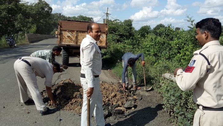 बोरगांव चौकी पुलिस की अनोखी पहल, स्वयं तगाड़ी फावड़ा उठाकर हाईवे पर भरे गड्ढे