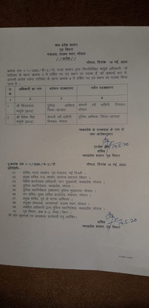 खंडवा एसपी शिवदयाल को हटा दिया गया है। उनके स्थान पर विवेक सिंह नये एसपी बनाए गए हैं।