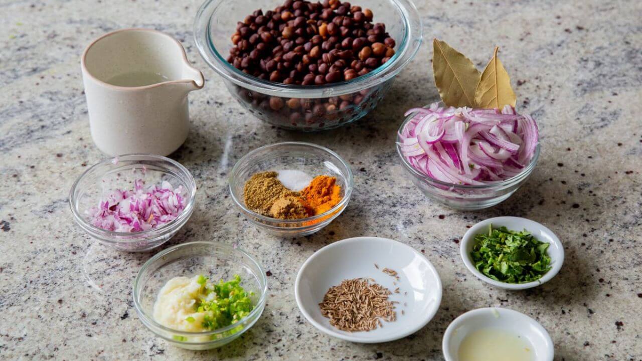 सबसे पहले आपको काला चना लेना है। इसके बाद प्याज (बारीक कटी हुई), हरी मिर्च, अदरक-लहसुन का पेस्ट, टमाटर, हल्दी पाउडर, धनिया पाउडर, जीरा पाउडर, लाल मिर्च पाउडर, गरम मसाला, तेज पत्ता, जीरा, तेल, नमक, हरा धनिया, नींबू का रस (यदि मौजूद हो) – इन सब इनग्रेडिएंट्स को एक साथ एकत्रित कर लें।