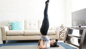 2: पीठ के बल लेटने के लिए पैरों को दीवार से सटाएं। कूल्हों को दीवार से थोड़ा दूर रखें।