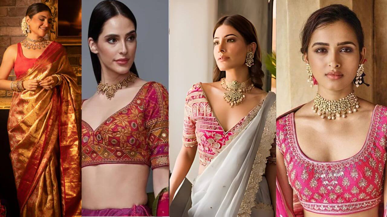 ब्लाउज के इस आकार में गले से लेकर नेकलाइन तक का हिस्सा खाली नजर आता है। इस सूनेपन को दूर करने के लिए इस पर गोलाकार लेयर्ड हार पहनें या फिर बिब नेकलेस भी पहन सकती हैं।
