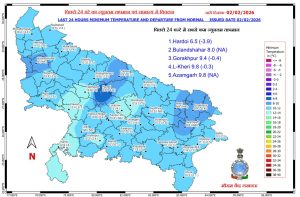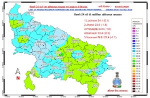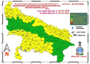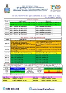 - मौसम विज्ञान केन्द्र (IMD), लखनऊ की ताजा दैनिक रिपोर्ट (2 फरवरी 2026) के मुताबिक, पश्चिमी विक्षोभ के असर से 2-3 फरवरी को पश्चिमी और पूर्वी उत्तर प्रदेश में कहीं-कहीं बारिश की संभावना जताई गई है। इस दौरान कहीं-कहीं मेघगर्जन, वज्रपात, झोंकेदार हवा (30 से 50 किमी प्रति घंटा) और ओलावृष्टि की संभावना है। 4 फरवरी को दोनों संभागों में घना कोहरा छाए रहने के आसार है।