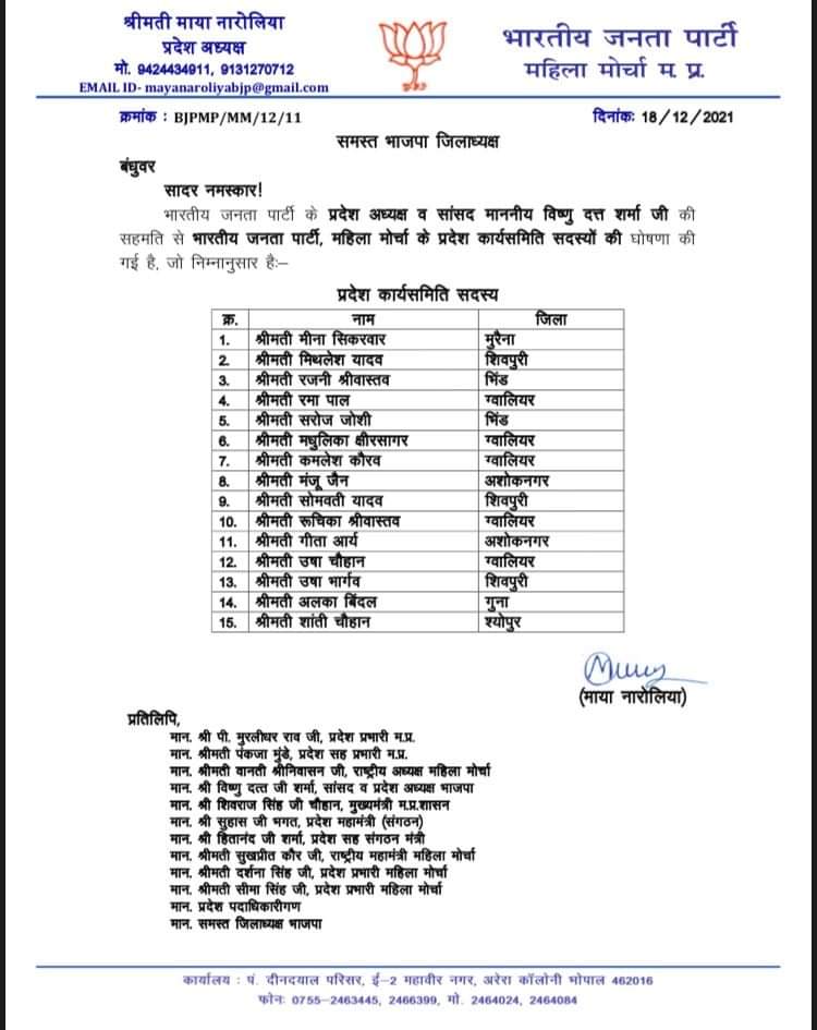 भोपाल, डेस्क रिपोर्ट। भारतीय जनता पार्टी के प्रदेश अध्यक्ष विष्णु दत्त शर्मा (BJP State President VD Sharma) की सहमति से महिला मोर्चा की प्रदेश अध्यक्ष माया नारोलिया ने प्रदेश कार्यसमिति सदस्यों के नाम की घोषणा की है, इस सूची में 15 सदस्यों के नामों की घोषणा की गई है।