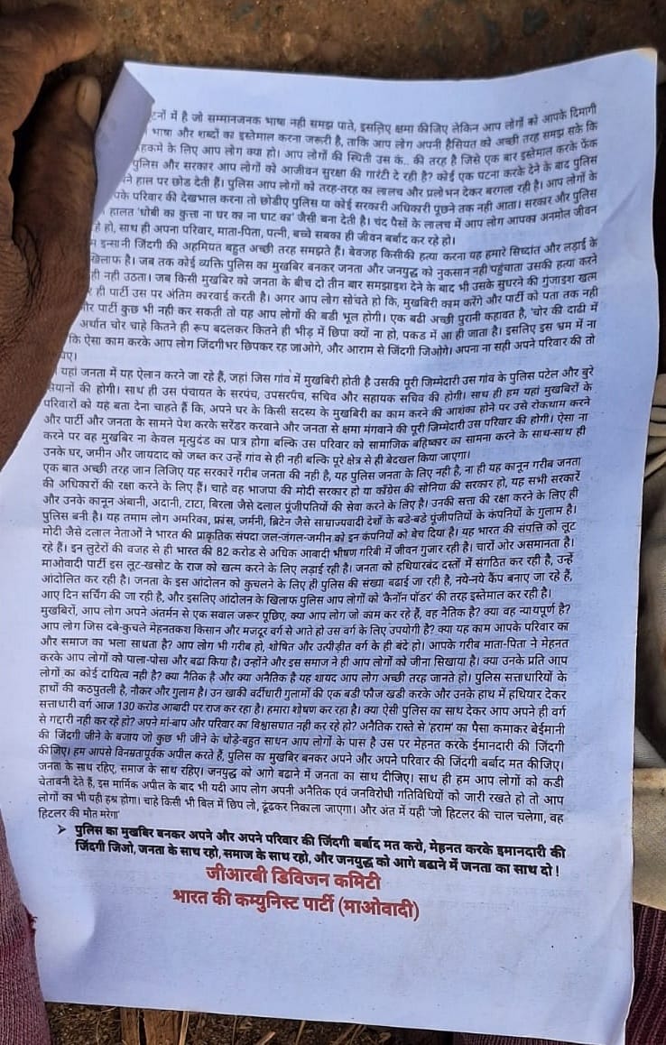 वहीं, ग्राम सरपंच दिलीप धनोले ने बताया कि उन्हें ग्रामीणों से सुबह पूर्व सरपंच को नक्सलियों द्वारा गोली मारने की जानकारी से मिली। जिस पर उन्होंने लांजी थाना प्रभारी को इसकी सूचना दी। बता दें कि पर्चे में मुखबिरों को चेतावनी दी है। यही नहीं बल्कि केन्द्र सरकार को पूंजीपति की सरकार बताते हुए पुलिस से दूर रहने और मुखबिरी नहीं करने की बात कही है। नक्सलियों ने कहा है कि यदि किसी गांव में मुखबिरी होती है तो उस व्यक्ति को इसकी सजा के साथ पंचायत के जनप्रतिनिधियों को भी इसका दंड भुगतान होगा।