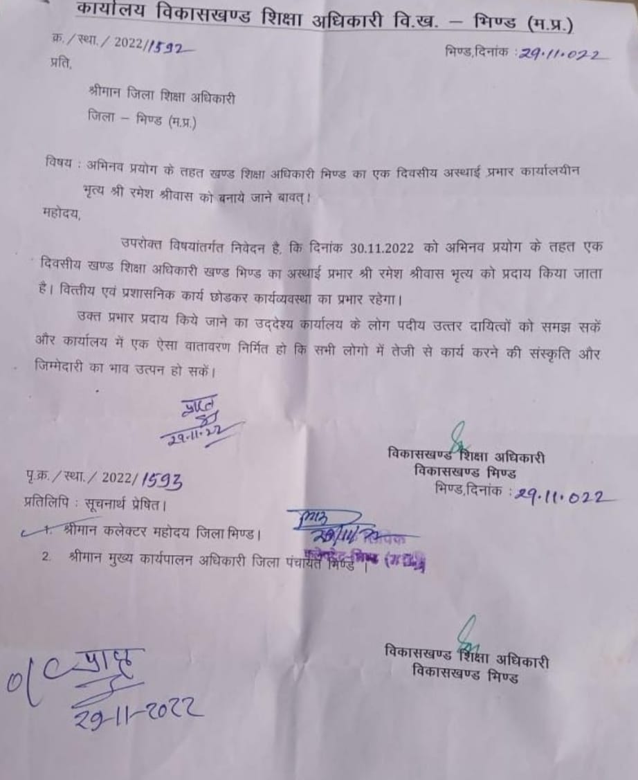 आप आश्चर्यचकित नहीं हों, दरअसल भिंड में शिक्षा विभाग ने एक अभिनव पहल करते हुए ये कदम उठाया है, बीईओ यानि विकास खंड शिक्षा अधिकारी भिंड सुदामा सिंह भदौरिया ने पहल करते हुए अपने ही कार्यालय में पदस्थ भृत्य रमेश श्रीवास को बीईओ की जिमेदारी सौंपी है , हालाँकि ये जिम्मेदारी केवल आज 30 नवंबर एक दिन के लिए सौंपी है जिसके लिए बाकायदा सरकारी आदेश भी उन्होंने जारी किया है।