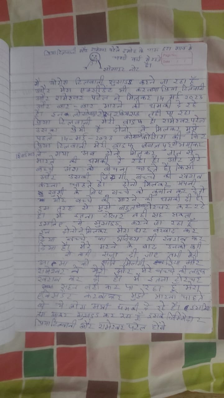 दरअसल, बरामद सुसाइड नोट में योगेश ने लिखा था कि उसकि पत्नी प्रिया टिलवानी और उसके प्रेमी रामेश्वर पटेल से वो परेशान हो गया था। जिसके कारण वो अपनी जीवन लीला समाप्त कर रहा है। सोसाइड नोट में मृतक को जान से मारने की कोशिश करने का जिक्र भी किया था। वहीं, उसके बच्चे की जिंदगी खराब न हो इसलिए उसका बच्चा उसके माता-पिता को देने की गुहार भी की गई है। पुलिस ने आरोपी रामेश्वर पटेल के खिलाफ आत्महत्या के लिए उकसाने का केस दर्ज कर उसे गिरफ्तार कर लिया है।