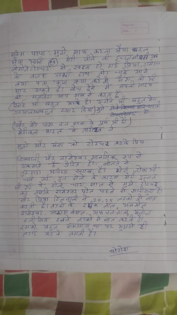 योगेश ने अपने पत्र में साफ लिखा है कि मेरे बेटे का भविष्य खराब करने वाली मेरी पत्नी प्रिया और रामेश्वर पटेल है। इन्हें कड़ी-से-कड़ी सजा मैं तो नहीं दे पा रहा हूं लेकिन मुझे उम्मीद है कि मेरे जाने के बाद कानून इन्हें कड़ी सजा देगा। योगेश ने पत्र में अपने बड़े भाई, भाभी, माता-पिता से माफी मांगी है। उसने कहा है कि प्रिया और उसका आशिक मुझे बार-बार यह धमकी देते है कि हम तुम्हारा और तुम्हारे बेटे का भविष्य खराब कर देगें।