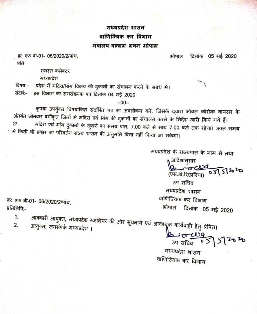 अंततः मध्य प्रदेश (madhya pradesh) सरकार (government) ने शराब माफियाओं (liquor mafia) की जुगलबंदी के सामने घुटने टेक दिए हैं। वाणिज्य कर विभाग (commercial tax department) से एक आदेश (circular) जारी किया गया है जिसमें शराब की दुकानें सुबह 7:00 बजे से शाम 7:00 बजे तक खोलने का निर्णय लिया गया है।