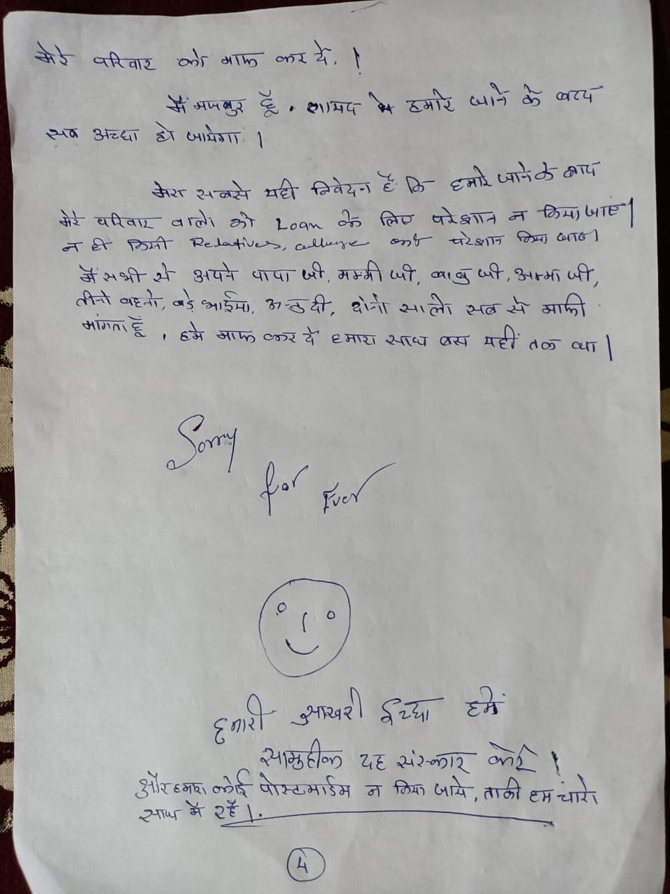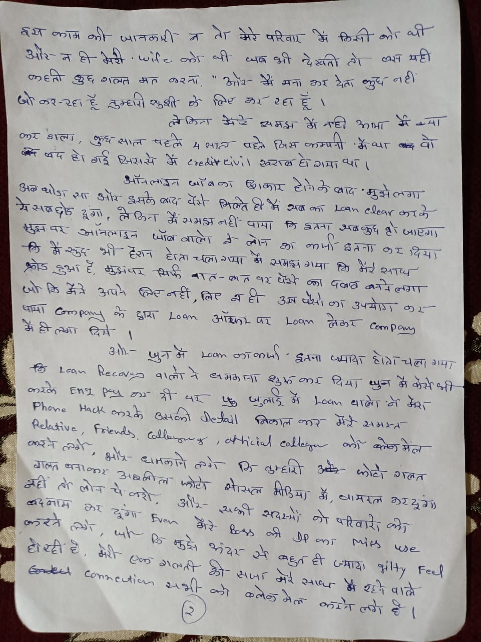 वहीं, जुलाई में लोन वालों ने मेरा फोन हैक करके उसकी डिटेल्स निकाल कर मेरे रिश्तेदारों, दोस्तों को बलैक्मेल करने लगे कि तुम्हारी अश्लील फोटो बनाकर सोशल मीडिया में वायरल कर देंगे नहीं तो लोन चुकाओ। केवल इतना ही नहीं, पूरे परिवार को भी बदनाम करने की धमकी भी दी। इसलिए मजबूर होकर आज मुझे यह कदम उठाना पड़ रहा है। नोट के आखिरी में लिखा कि मेरा ये निवेदन है कि हमारे जाने के बाद मेरे परिवार वालों, रिश्तेदारों और दोस्तों को लोन के लिए परेशान न किया जाए। मैं सभी से माफी मांगता हूँ, हमें माफ कर दें।