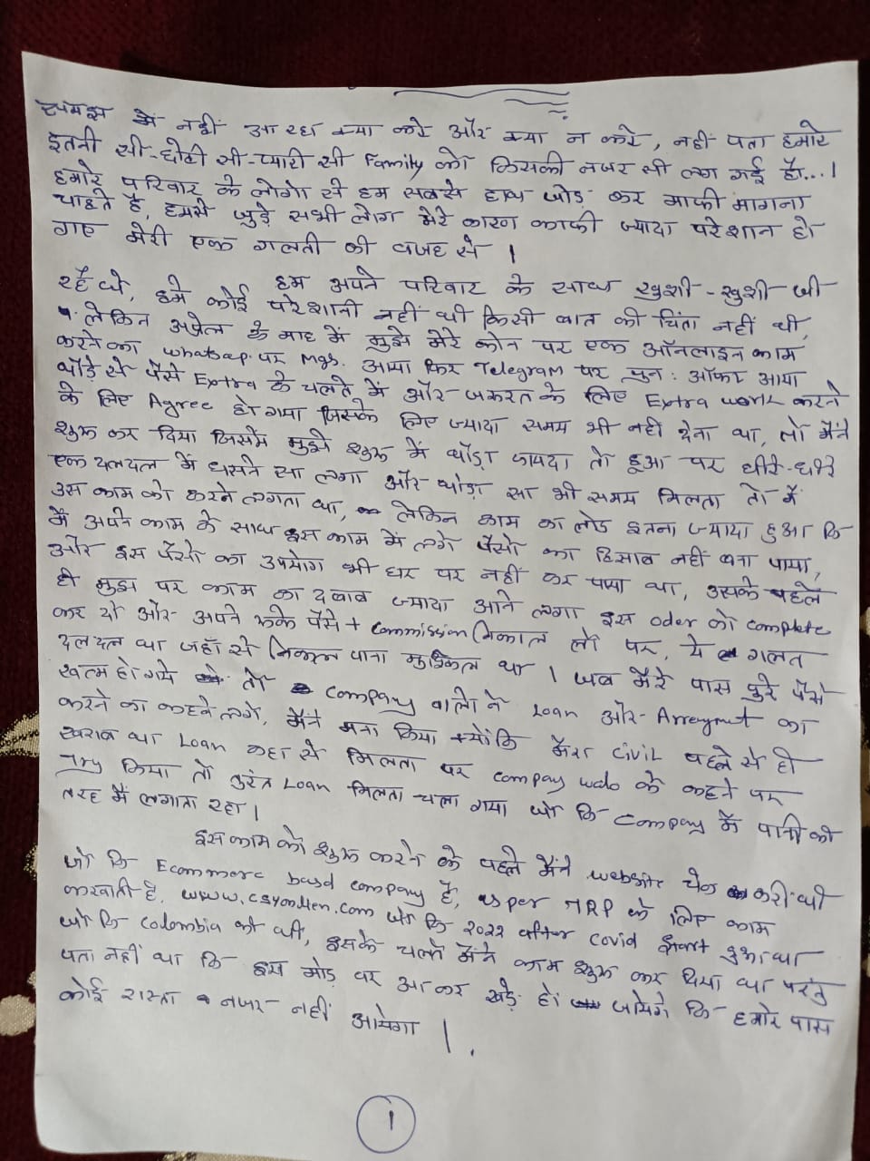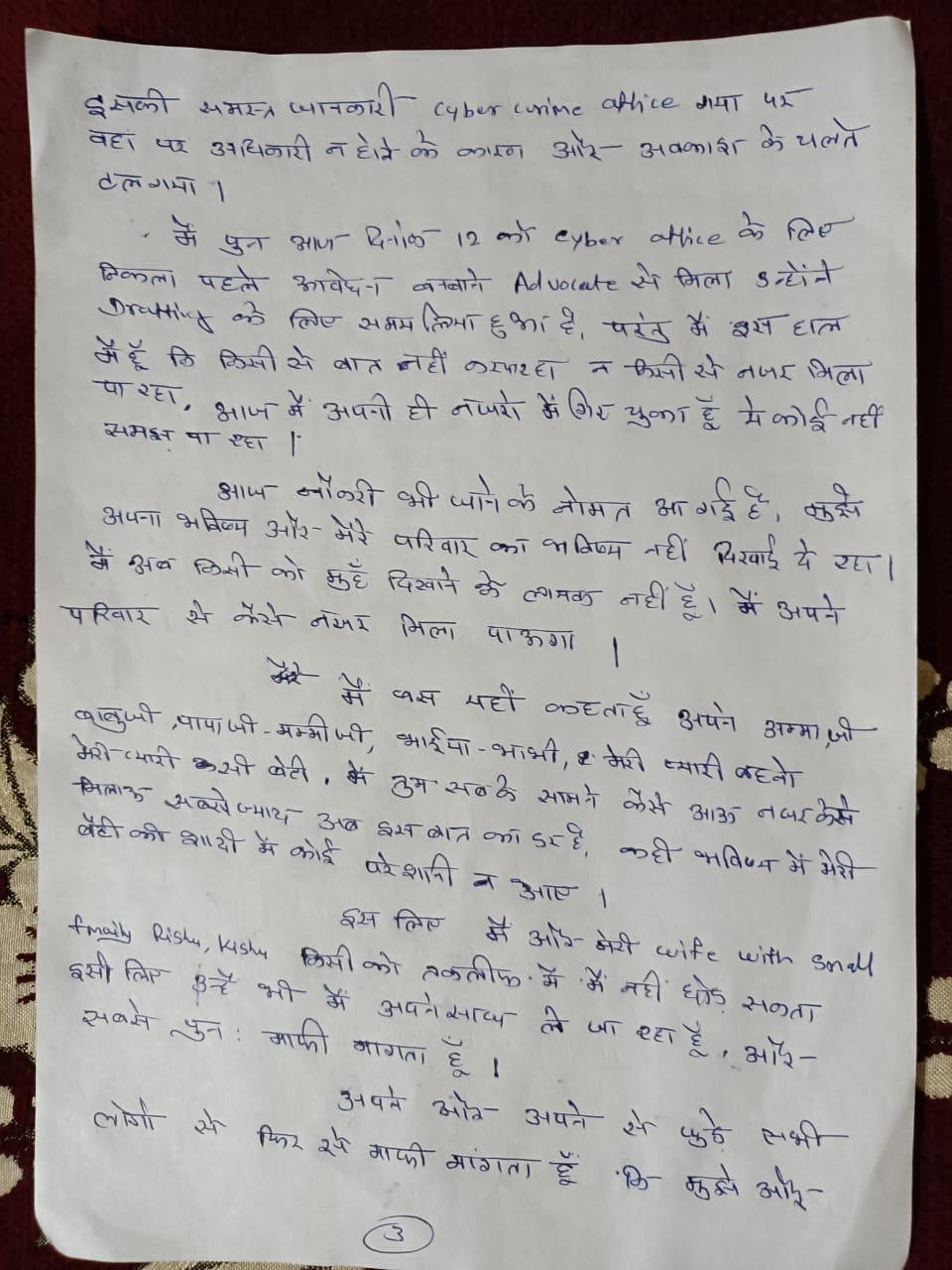 आगे नोट में मृतक ने लिखा कि इस काम की जानकारी उसके परिवार में किसी को नहीं थी। यहां तक की उसकी पत्नी को भी इस काम की भनक नहीं थी। वहीं, ऑनलाइन जॉब देने वाली कंपनी का शिकार होने के बाद मुझे लगा कि पैसे मिलते ही मैं सब का लोन चुका दुंगा और ये सब छोड़ दूंगा लेकिन मैं समझ नहीं पाया कि इतना सब कुछ हो जाएगा। मुझ पर कंपनी वालों ने लोन का कर्जा इतना कर दिया कि मैं खुद भी हैरान होता चला गया। मैं समझ गया कि मेरे साथ फ्रोड हुआ है। कंपनीवालों ने बात-बात पर पैसे का दबाव बनाना शुरू दिया और जून में लोन का कर्जा इतना ज्यादा हो गया कि लोन रिकवर करने वालों ने धमकाना शुरू कर दिया। जिसके बाद मैनें किसी भी तरह पैसे इक्कठा कर लोन चुका दी।