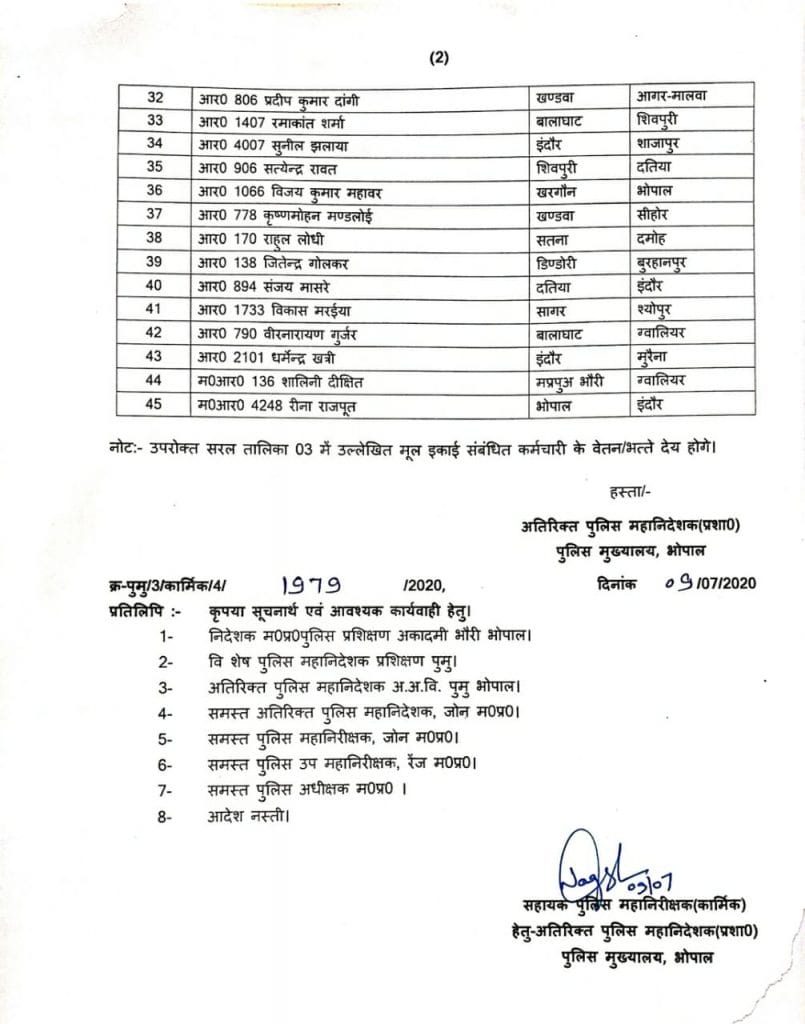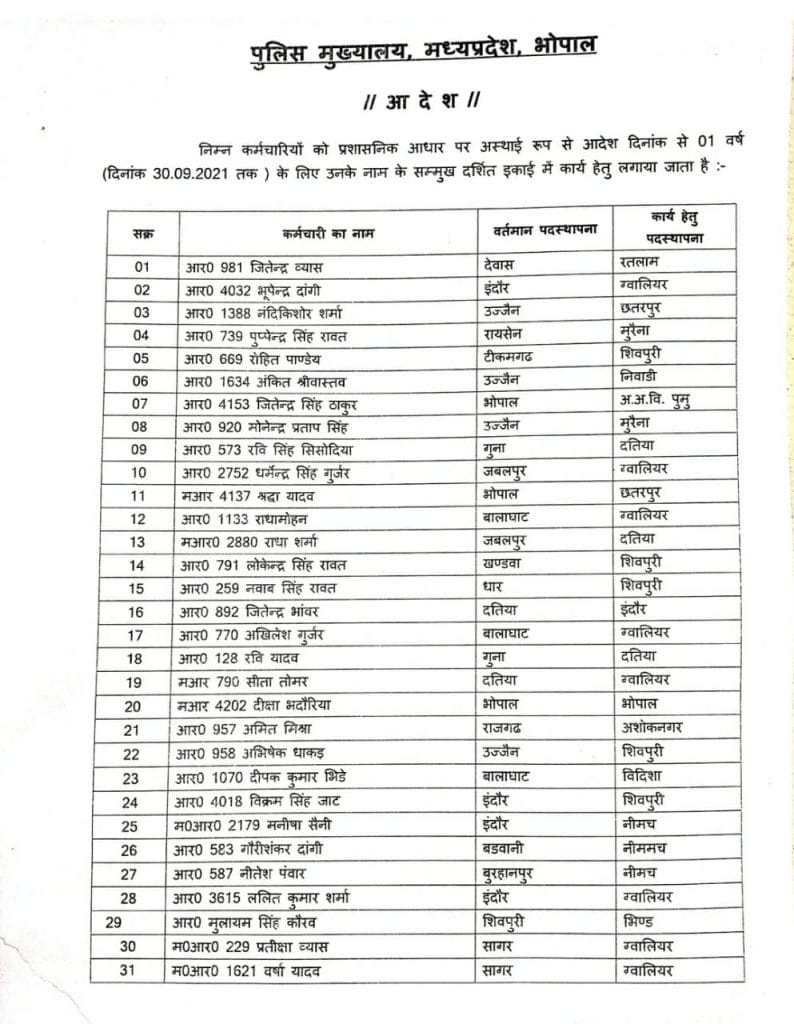 भोपाल| मध्य प्रदेश में तबादलों का दौर जारी है| अब पुलिस महकमे में बड़ा फेरबदल किया गया है| पुलिस मुख्यालय ने आरक्षकों की पोस्टिंग एक साल के लिए दुसरे जिले में की है|