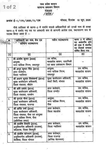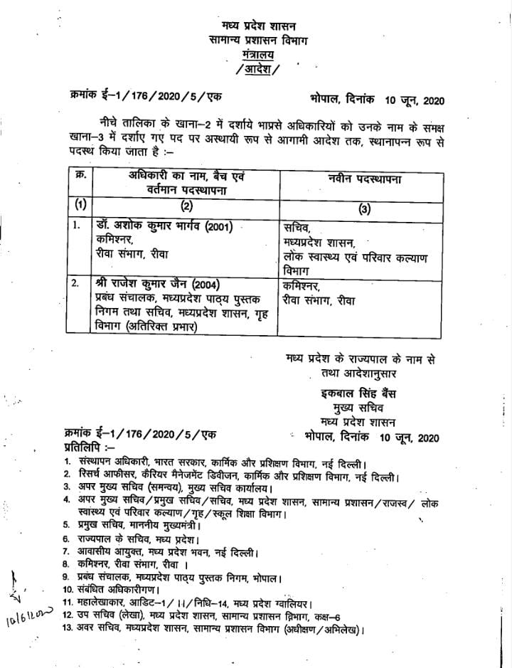 भोपाल| मध्य प्रदेश (Madhya Pradesh) में तबादलों (Transfer) का दौर जारी है| बुधवार को ही राज्य शासन ने आठ आईएएस (IAS) अधिकारियों की तबादला सूची जारी की थी| अब दो और आईएएस अधिकारियों के तबादले किये गए हैं| अशोक कुमार भार्गव, कमिश्नर रीवा संभाग को सचिव मप्र शासन लोक स्वास्थ्य एवं परिवार कल्याण विभाग पदस्थ किया गया है| वहीं राजेश कुमार जैन रीवा संभाग के नए कमिश्नर होंगे|