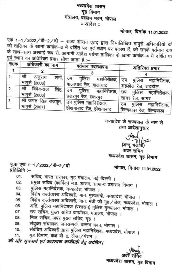 भोपाल, डेस्क रिपोर्ट। राज्य सरकार द्वारा प्रदेश के 3 आईपीएस अधिकारियों को उनके वर्तमान कार्य और पद के साथ ही अस्थाई रूप से अगले आदेश तक अन्य स्थानों का भी अतिरिक्त प्रभार सौंपा गया है,देखिए लिस्ट…