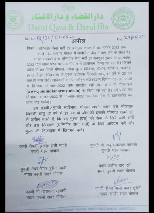 शहर काजी सहित नायब काजी, मुफ्ती शहर, नायब मुफ्ती ने मुस्लिम समाज के युवाओं को भी इस रैली में शामिल होकर देश सेवा करने की अपील की है, वही इसके लिए बाकायदा पत्र भी जारी किया गया है, गौरतलब है कि केंद्र सरकार ने इसी साल से भारतीय सेना में अग्निवीर योजना शुरू की है, हालांकि इस योजना का पूरे देश सहित मध्यप्रदेश में भी विरोध हुआ था, वही अब भोपाल में यह रैली आयोजित होने जा रही है, ऐसे में खुद मुस्लिम समाज ने आगे आकर इस रैली में आपन समाज के साथ ही अन्य युवाओ को भी इसमें शामिल होकर देश सेवा करने की अपील की है।