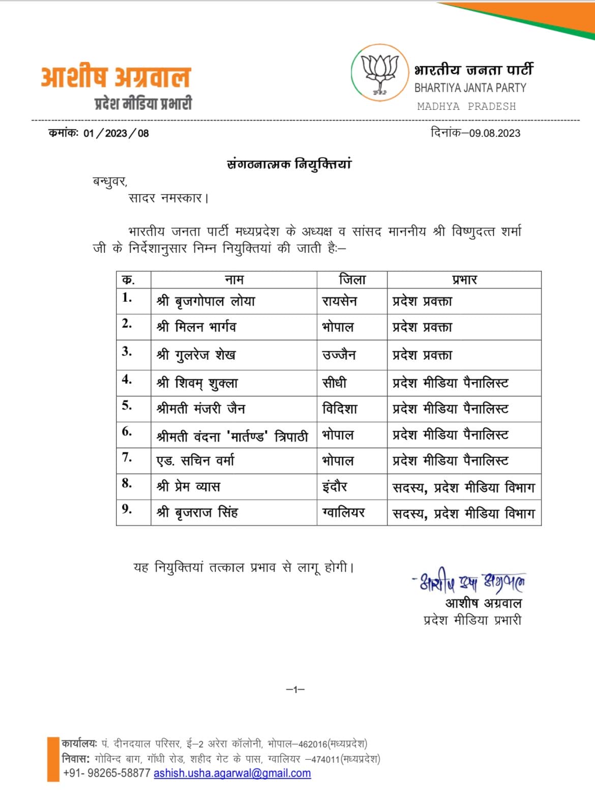 MP News : मप्र में विधानसभा चुनाव की तैयारी कर रही भाजपा (BJP) ने मीडिया विभाग का विस्तार किया है, पार्टी ने आज एक नियुक्ति आदेश जारी किया है जिसमें 9 नेताओं को मीडिया विभाग में अलग अलग दायित्व दिए गए हैं।