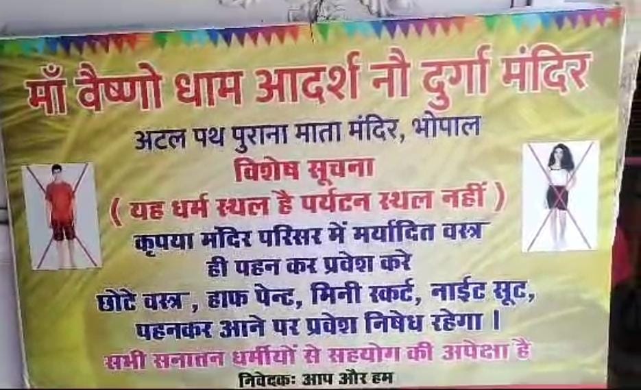 BHOPAL NEWS : भोपाल शहर के कुछ मंदिरों में भी बैनर पोस्टर चस्पा कर दिए गए है जिनमें मंदिर आने वाली महिला श्रद्धालुओं के लिए ड्रेस कोड निर्धारित किया गया है। मां वैष्णो धाम आदर्श नो दुर्गा मंदिर पर महिला एवं पुरुषों के लिए यह बोर्ड लगा दिया गया है।