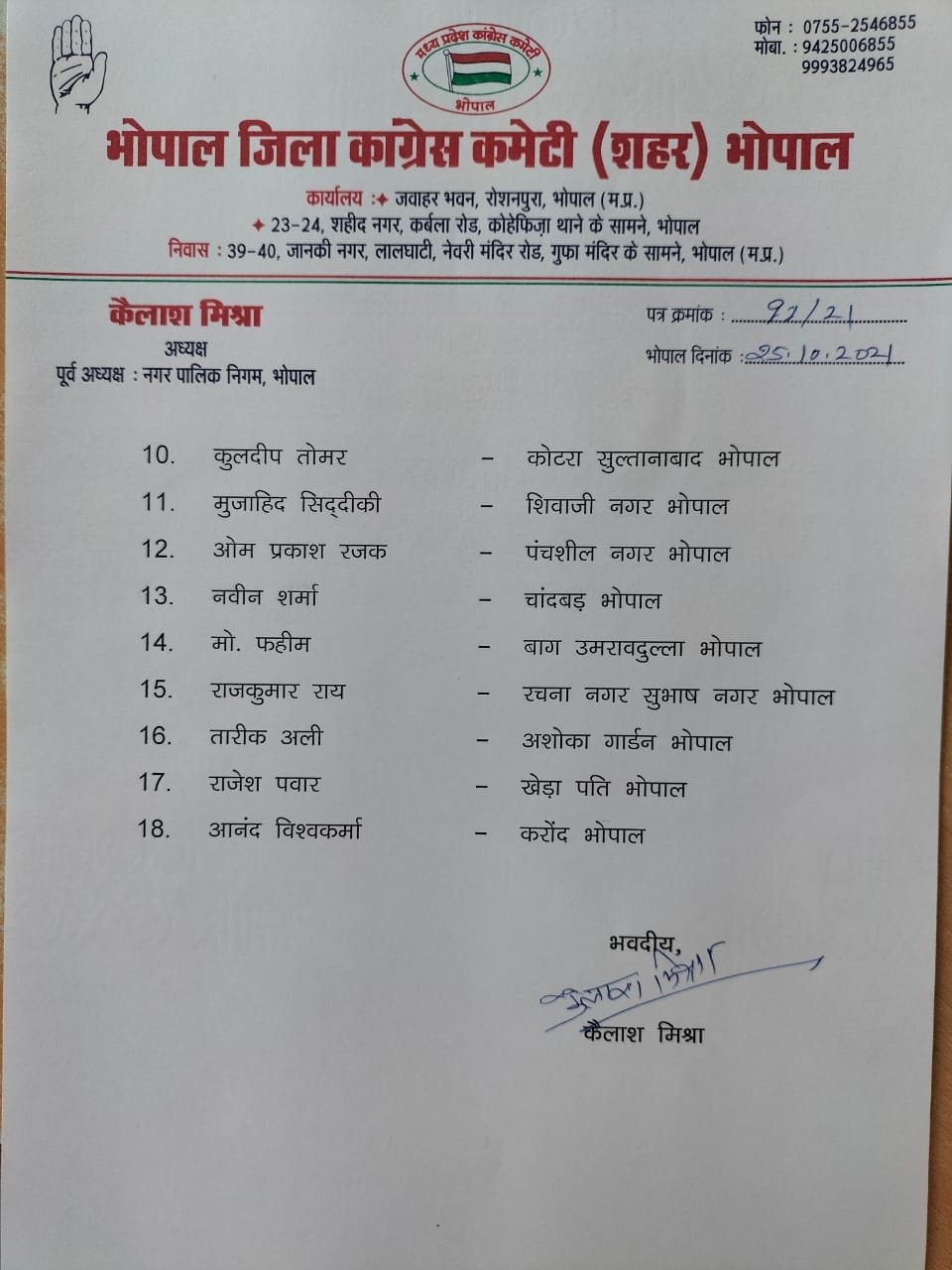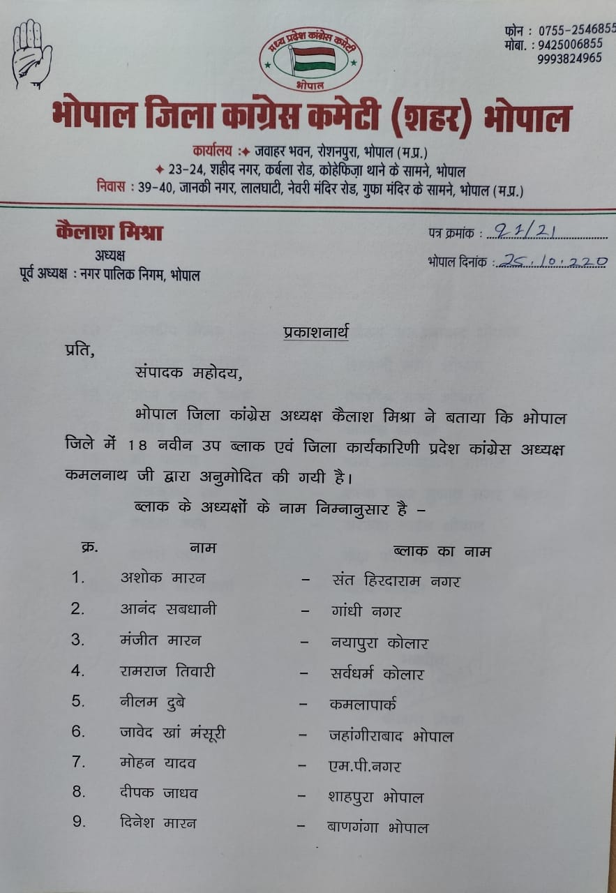 भोपाल जिला कांग्रेस कमेटी के अध्यक्ष कैलाश मिश्रा ने बताया कि प्रदेश कांग्रेस अध्यक्ष कमलनाथ (Kamal Nath) के अनुमोदन से 28 नए उप ब्लॉक बनाए गए है। इसमें 18 के कांग्रेस उप ब्लॉक अध्यक्षों के नाम घोषित किए गए है और 10 नाम जल्द घोषित किए जाएंगे। भोपाल जिला कांग्रेस कमेटी की कार्यकारिणी घोषित की गई है। इसमें 6 विधानसभा में उपाध्यक्ष, महामंत्री, सचिव करीब 300 लोगों की कमेटी बनाई गई है।
