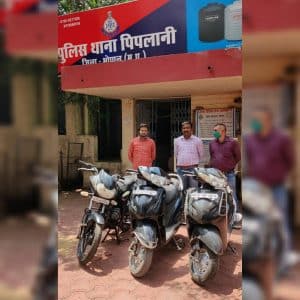 भोपाल, डेस्क रिपोर्ट। मप्र (MP) के राजधानी भोपाल (Bhopal) की पिपलानी पुलिस ने 2 वाहन चोरो को पकड़ने में सफलता हासिल की है, वही चोरों के पास से 4 दो पहिया वाहन भी बरामद किये है। आरोपी भोपाल के छोलामंदिर के गौदाम थाना क्षेत्र का निवासी बताया जा रहा है।
