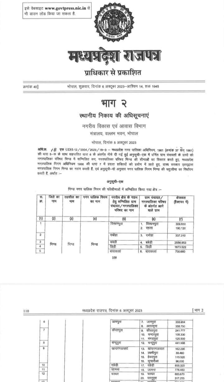MP News : मध्य प्रदेश विधानसभा चुनाव की आचार संहिता लगने से पहले शिवराज सरकार द्वारा लोकापर्ण-शिलान्यास और सौगातों का सिलसिला जारी है। पांढुर्णा और मैहर को नया जिला घोषित करने के बाद अब भिण्ड नगरपालिक निगम और 5 नगर परिषद के गठन की अधिसूचना जारी जारी की गई है। इसी के साथ भिंड 17वीं नगर निगम बन गई है, जिसका नोटिफिकेशन भी मध्यप्रदेश नगरीय विकास एवं आवास मंत्रालय ने जारी कर दिया है।