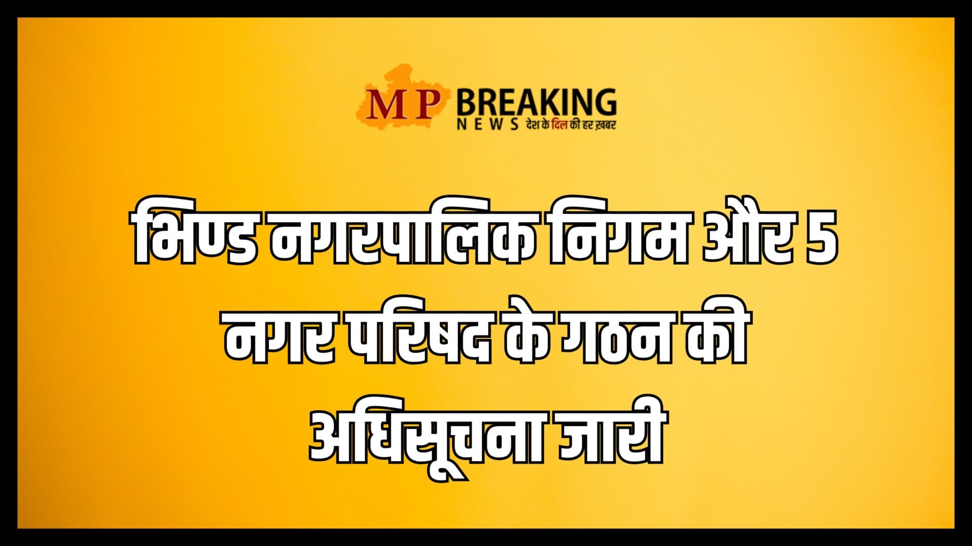 नगरीय विकास एवं आवास मंत्री भूपेन्द्र सिंह ने बताया है कि नगरपालिक निगम भिण्ड और 5 नगर परिषद के गठन की अधिसूचना जारी की गयी है। नगरपालिक निगम भिण्ड में नगर पालिका परिषद भिण्ड और 24 ग्राम पंचायतों को शामिल किया गया है।मंत्री सिंह ने बताया है कि साथ ही सागर जिले में बरोदिया नोनगर, सिंगरौली जिले में चितरंगी, कटनी जिले में उमरियापान, रायसेन जिले में बम्होरी और शिवपुरी जिले में दिनारा नगर परिषद का गठन किया गया है। मुरैना जिले में जौरा नगर परिषद को पालिका परिषद बना दिया गया ।