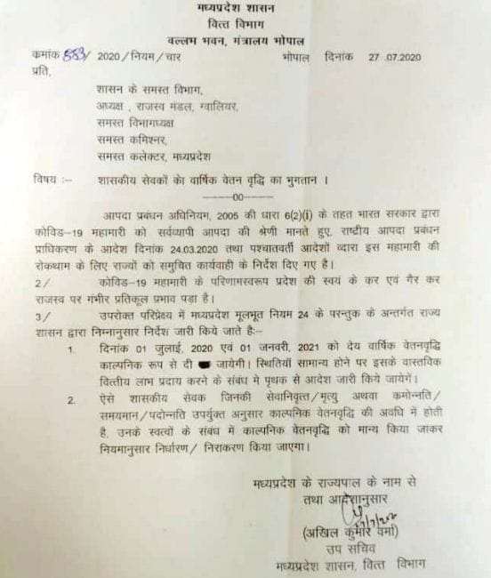 भोपाल| मध्य प्रदेश (Madhya Pradesh) के लाखों शासकीय कर्मचारी अधिकारियों (Government Employees) के लिए रहत भरी खबर है| सरकार द्वारा वार्षिक वेतनवृद्धि (Annual increment) का लाभ तय समय से दिया जाएगा| हालाँकि इसका भुगतान स्थितियां सामान्य होने पर किया जाएगा। सोमवार को वित्त विभाग द्वारा इस सम्बन्ध में आदेश जारी किये गए हैं|