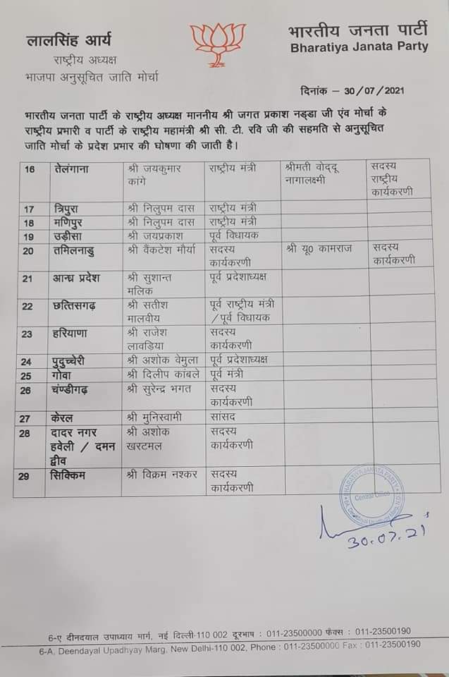 आप सभी को हार्दिक बधाई एवं शुभकामनाऐं।@blsanthosh @v_shrivsatish @BJPSCMorcha pic.twitter.com/mrIiUm20TS— Lal Singh Arya (मोदी का परिवार) (@LalSinghArya) July 30, 2021