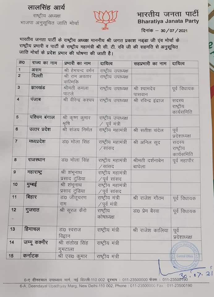 @BJP4India के राष्ट्रीय अध्यक्ष श्री @JPNadda जी एवं मोर्चा प्रभारी व राष्ट्रीय महामंत्री श्री @CTRavi_BJP जी की सहमति से अनुसूचित जाति मोर्चा के प्रदेश प्रभारियों की नियुक्ति की गई।