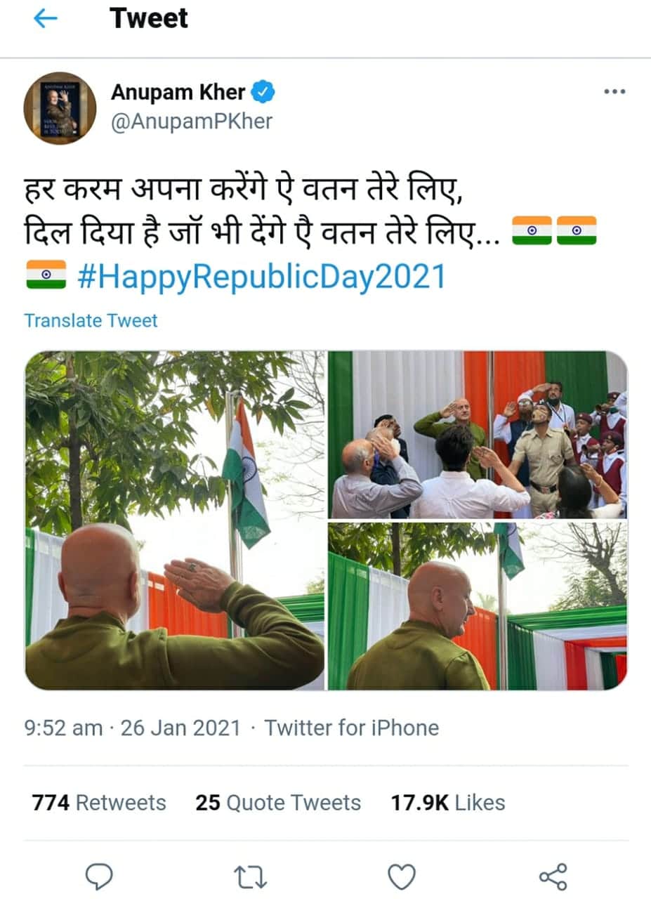 जाने माने कलाकार अनुपम खेर (Anupam kher) ने भी तिरंगे को सलाम करते हुए तस्वीर शेयर की है।