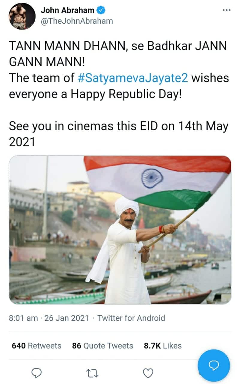 फिटनेस फ्रीक जॉन अब्राहम (John Abraham) ने बिल्कुल अलग अंदाज में देसी अवतार के साथ तिरंगा लहराते हुए गणतंत्र दिवस की शुभकामनाएं दी हैं।