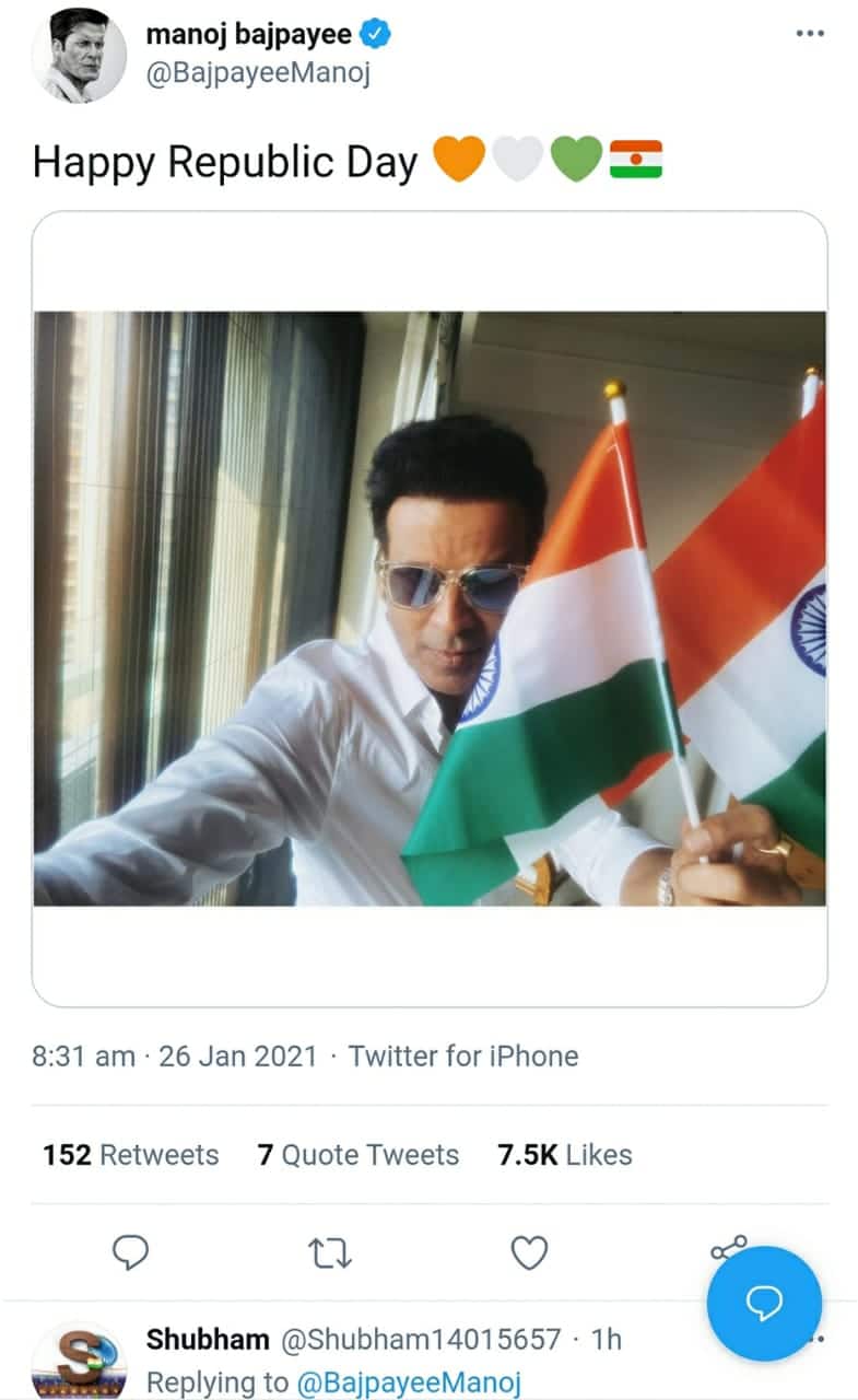 अपनी एक्टिंग का लोहा मनवा चुके मनोज बाजपेई (Manoj bajpayee) ने भी तिरंगे के साथ तस्वीर शेयर की है
