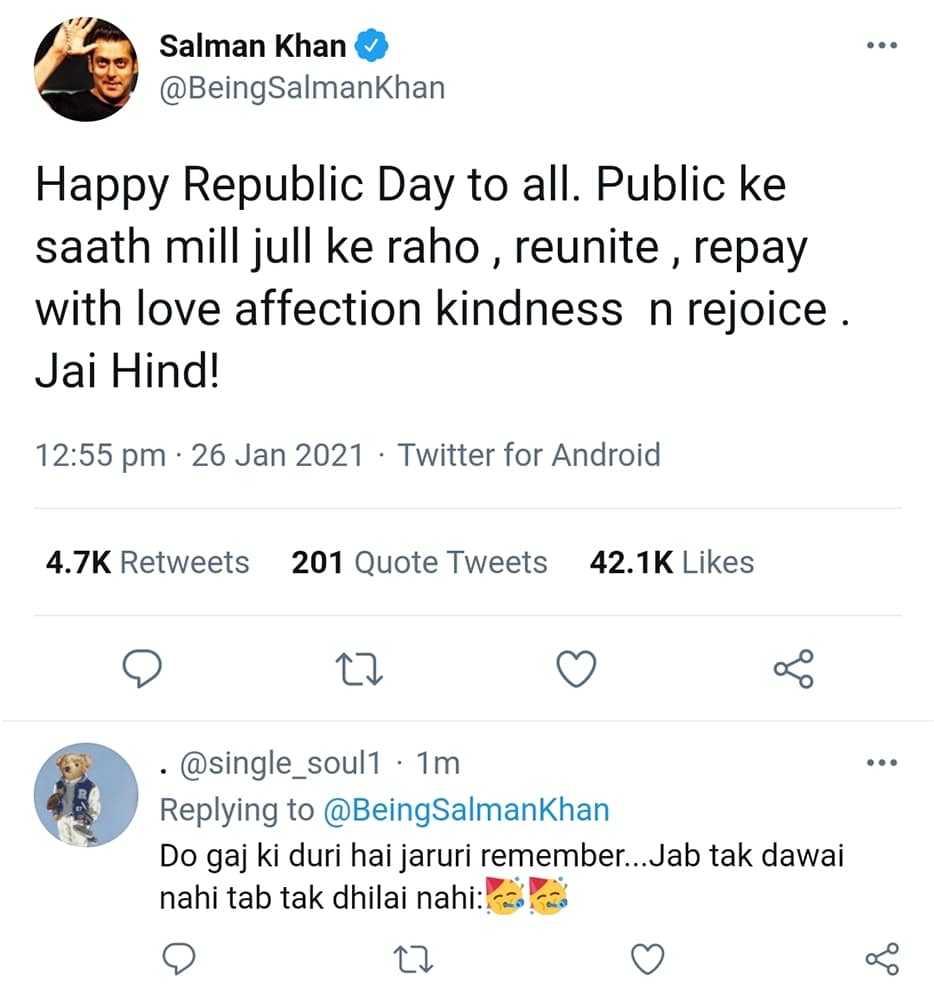 Happiness peace prosperity and .. be safe .. be protected pic.twitter.com/EWRLN0OMXJ— Amitabh Bachchan (@SrBachchan) January 25, 2021
