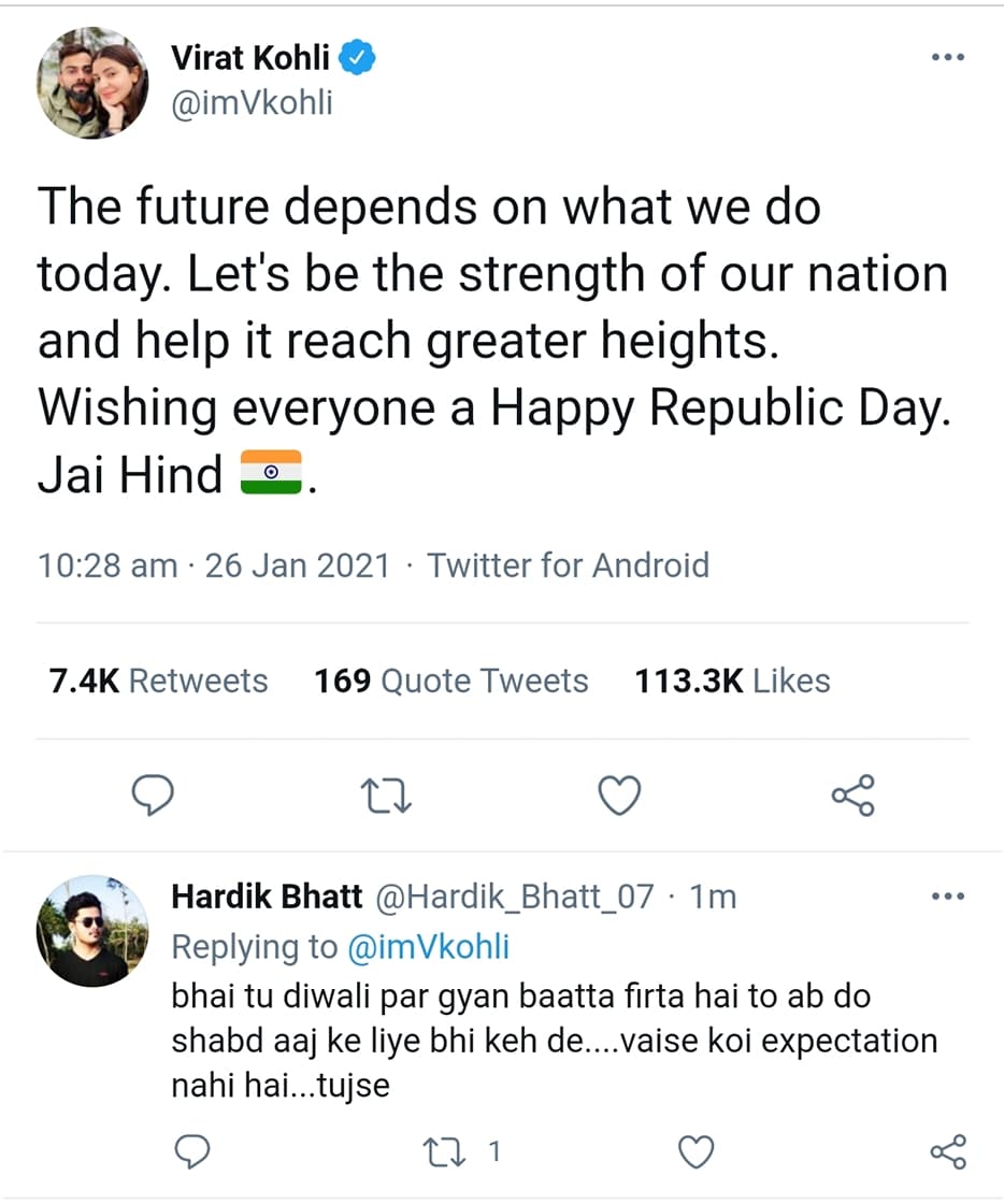 हाल ही में पापा बने क्रिकेटर विराट कोहली (Virat kohli) के लिए ये गणतंत्र दिवस और खास हो गया है। उन्होने अपने ट्विटर हैंडल से लिखा है कि हमारा भविष्य हमारे आज के कर्मों पर निर्भर करता है, आईये देश की ताकत बनते हैं।