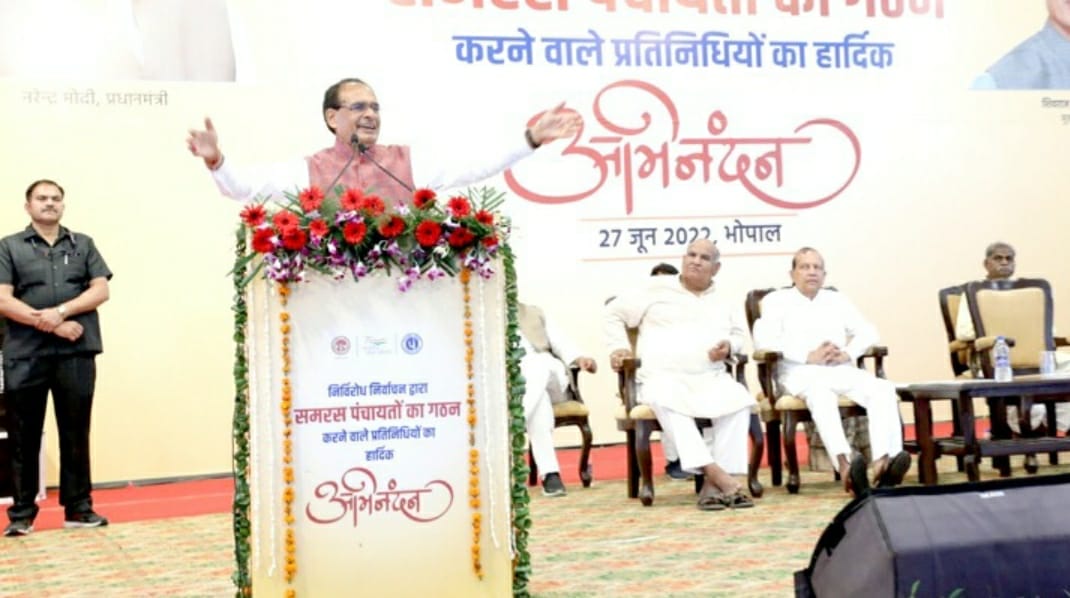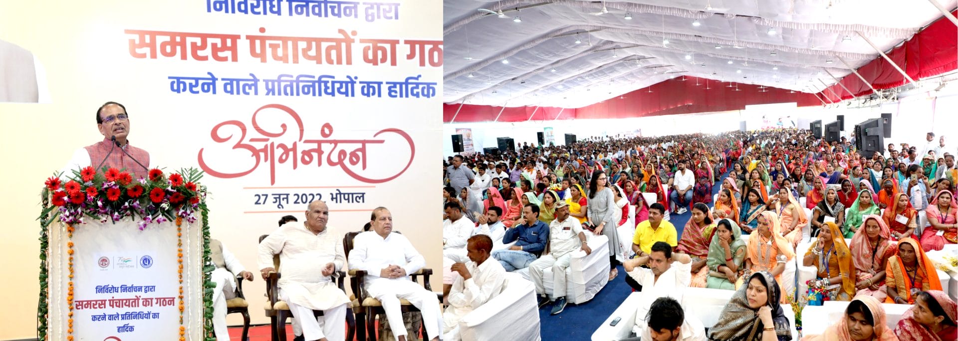 मुख्यमंत्री शिवराज सिंह चौहान मुख्यमंत्री निवास परिसर में निर्विरोध निर्वाचन द्वारा समरस पंचायतों का गठन करने वाले प्रतिनिधियों के अभिनंदन समारोह को संबोधित कर रहे थे। मुख्यमंत्री ने पंचायत प्रतिनिधियों को निर्विरोध निर्वाचित करने वाले ग्रामवासियों का आभार माना।