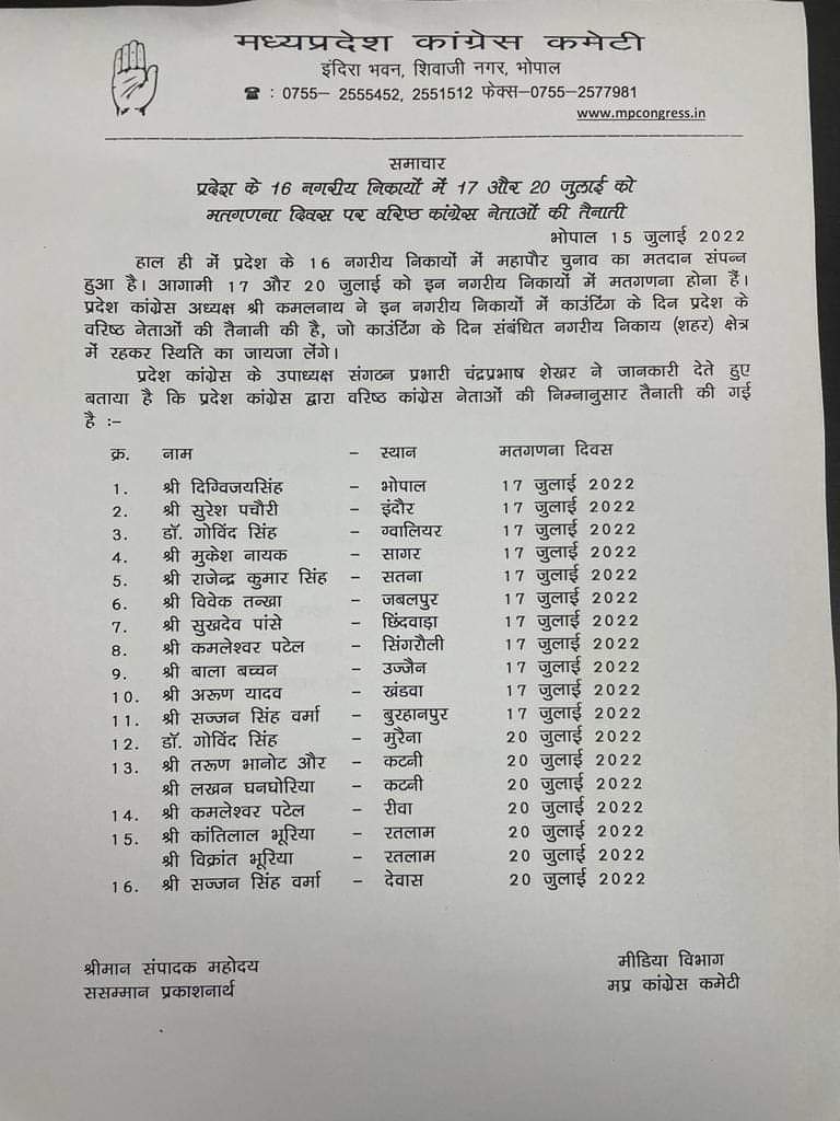भोपाल, डेस्क रिपोर्ट। मध्य प्रदेश के 16 नगरीय निकायों में महापौर चुनाव की मतगणना 17 और 20 जुलाई को होनी है। प्रदेश कांग्रेस अध्यक्ष कमलनाथ ने इन नगरीय निकायों में काउंटिंग के दिन प्रदेश के वरिष्ठ नेताओं की तैनाती की है, जो काउंटिंग के दिन संबंधित नगरीय निकाय (शहर) क्षेत्र में रहकर स्थिति का जायजा लेंगे।