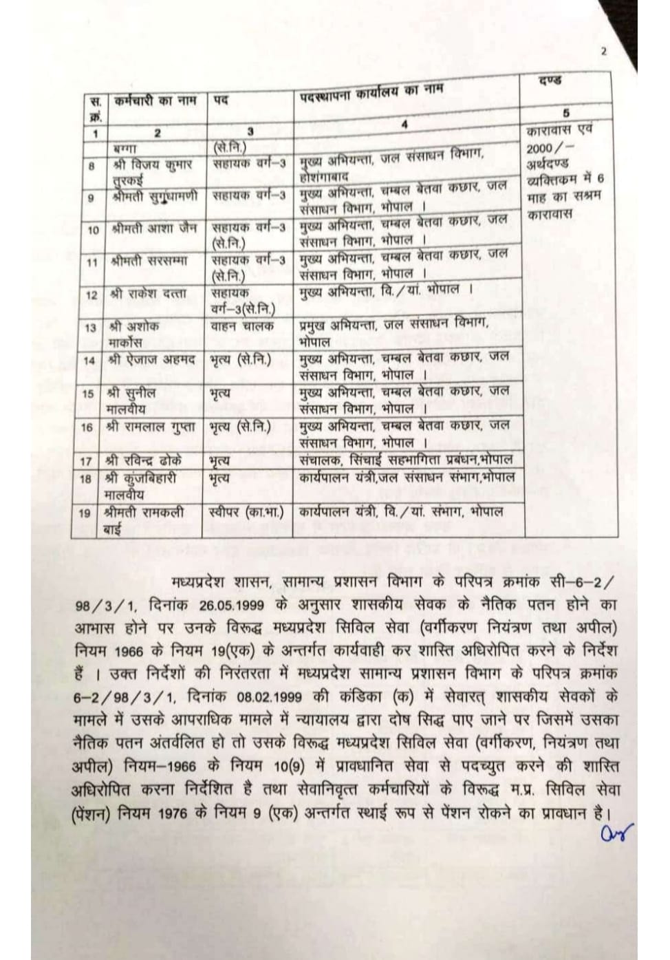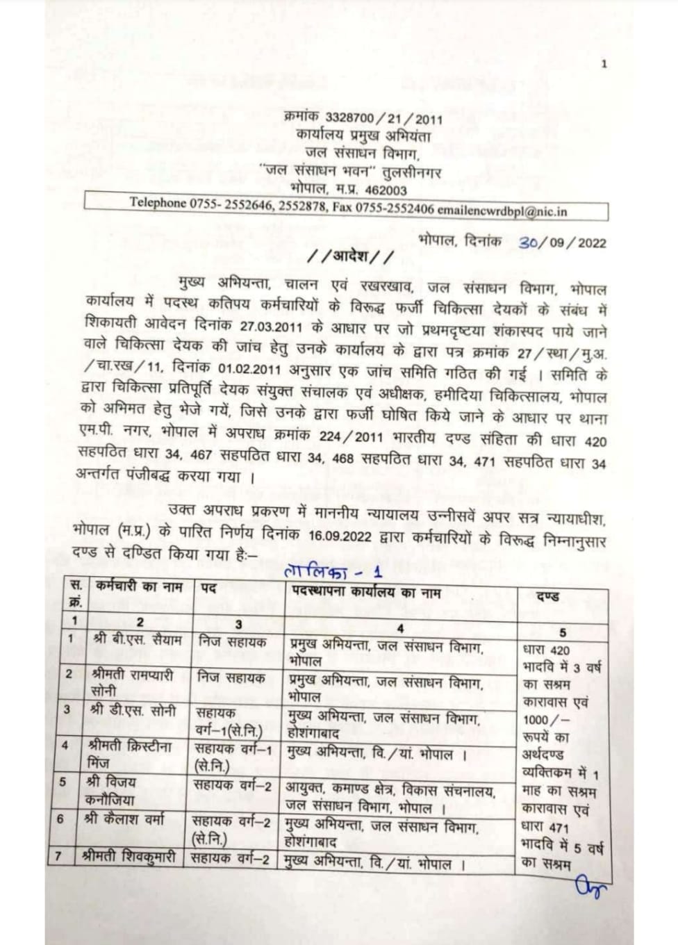 प्रमुख अभियंता जल संसाधन विभाग (MP Water Resources Department) भोपाल द्वारा एक आदेश जारी किया गया है जिसमें कोर्ट के एक आदेश का हवाला दिया जाकर 19 कर्मचारियों की सजा की जानकारी दी गई है। न्यायालय 19वें अपर सत्र न्यायाधीश के आदेश को आधार बताकर विभाग ने आदेश दिया है कि विभाग में पदस्थ 19 कर्मचारियों के विरुद्ध फर्जी चिकित्सा देयकों के सम्बन्ध में शिकायत की जांच के बाद पुलिस में शिकायत की गई थी। मामला 2011 का है।