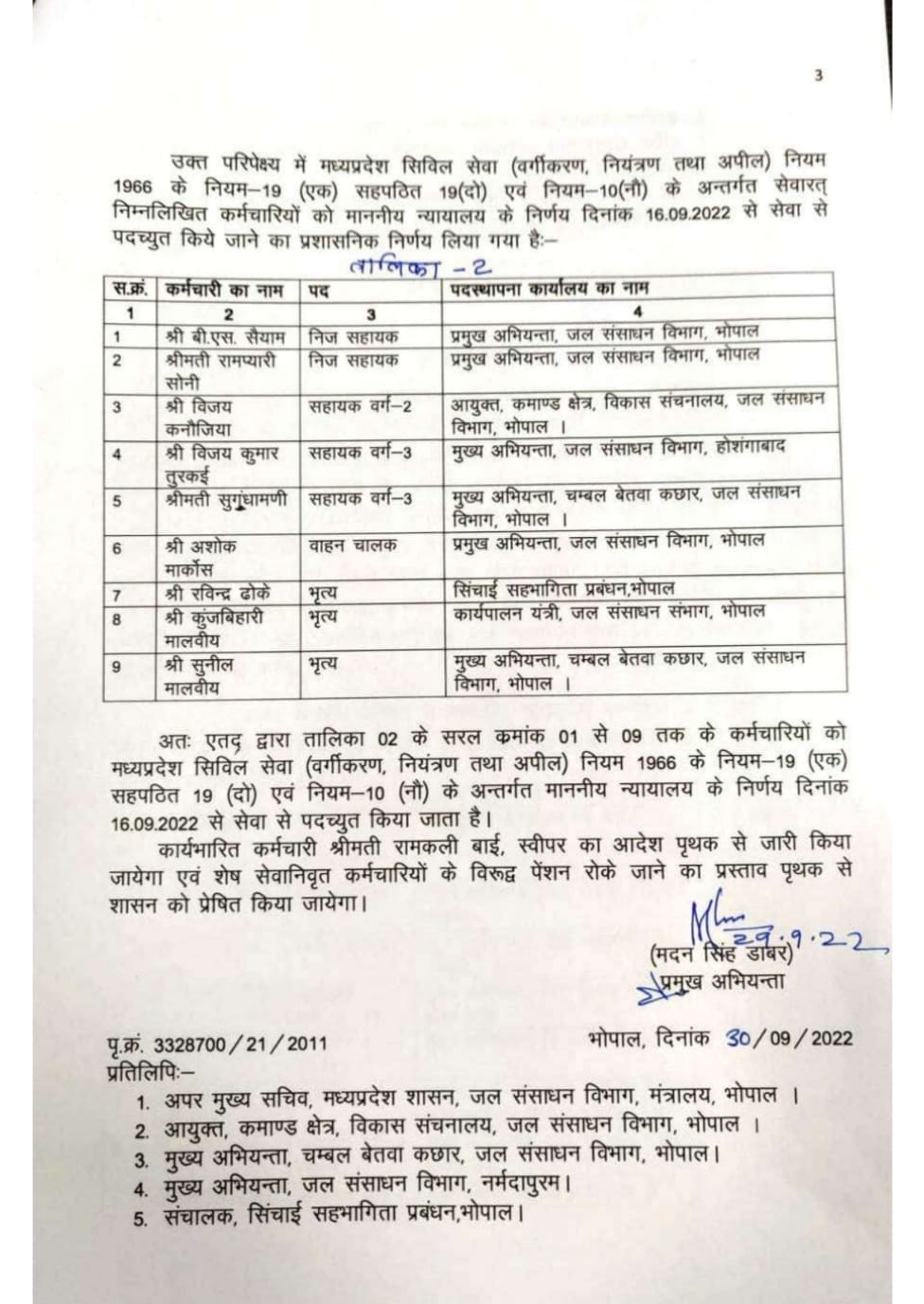 प्रमुख अभियंता के आदेश में आगे कहा है कि न्यायालय के फैसले के बाद इनमें से 9 कर्मचारियों की सेवा समाप्ति का भी फैसला किया गया है। जिन कर्मचारियों की सेवाएं समाप्ति के आदेश हुए हैं उनमें 2 निज सहायक, एक सहायक वर्ग 2, दो सहायक वर्ग 3, एक वाहन चालक और 3 भृत्य शामिल हैं।