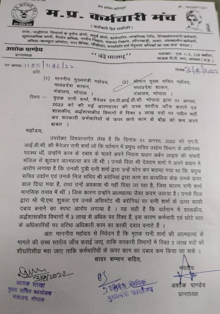मप्र कर्मचारी मंच के प्रदेश अध्यक्ष अशोक पाण्डेय ने मुख्यमंत्री शिवराज सिंह को पत्र लिखकर रानी शर्मा आत्महत्या मामले (female employee suicide case)की उच्च स्तरीय जांच का निवेदन किया है। पत्र में कर्मचारी नेता ने लिखा कि रानी शर्मा प्रमुख सचिव उद्योग विभाग के अधीनस्थ एमपीआईडीसी में मैनेजर थी उन्होंने काम के बोझ के दबाव के कारण आत्महत्या (MPIDC Manager Rani Sharma suicide case) कर ली।