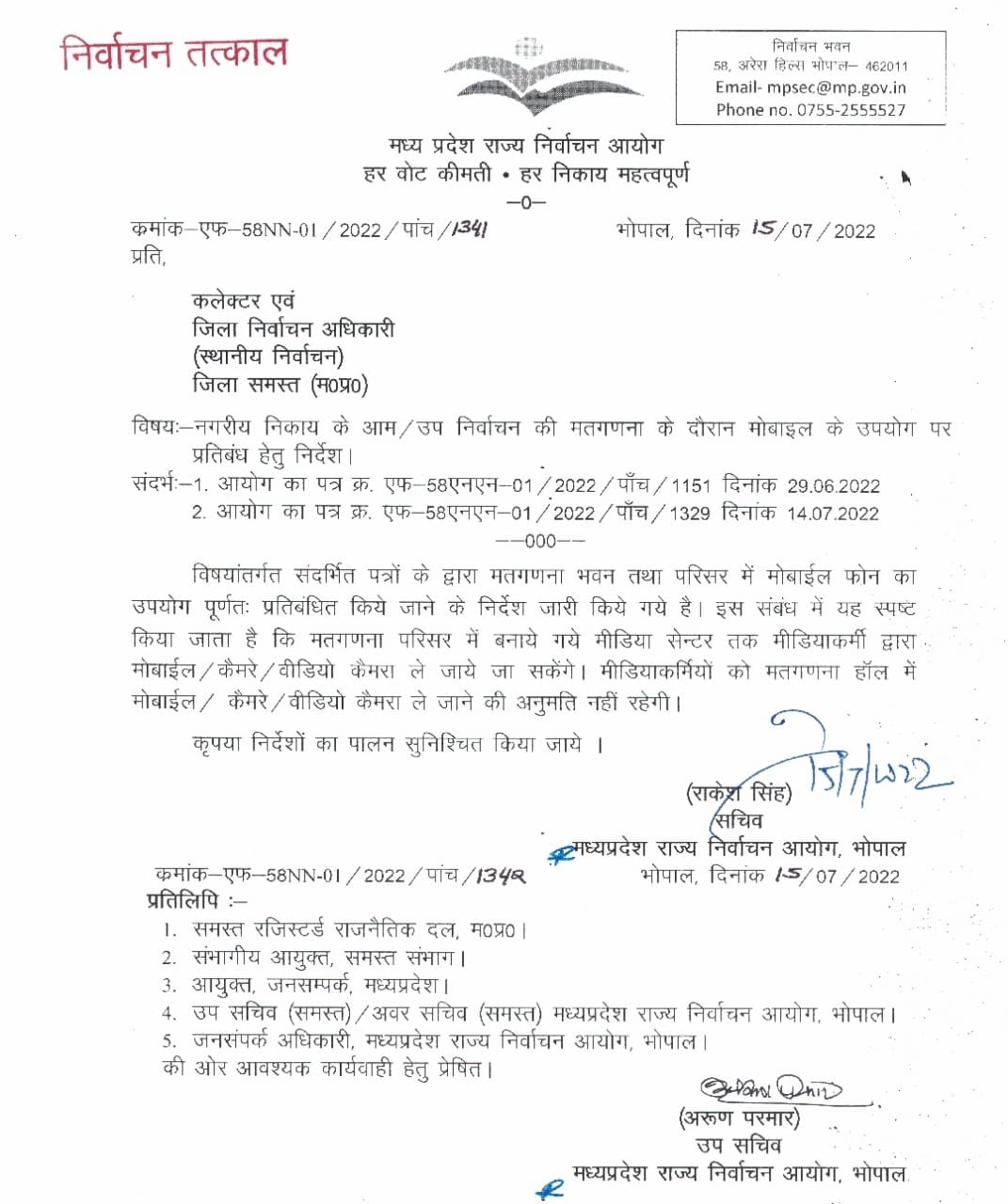 भोपाल, डेस्क रिपोर्ट। मप्र राज्य निर्वाचन आयोग (MP State Election Commission) ने मतगणना स्थल पर मोबाइल पर प्रतिबंध (Mobile ban in counting of votes) किये जाने संबंधी आदेश में संशोधन किया है। निर्वाचन आयोग ने आज शक्रवार को संशोधित आदेश जारी कर पत्रकारों को मोबाइल ले जाने की अनुमति देते हुए नए निर्देश जारी किये है।