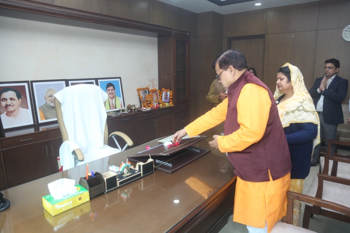 पूजा अर्चना कर कुर्सी पर बैठे ऊर्जा मंत्री प्रद्युम्न सिंह तोमर